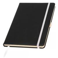 Записная книжка формата А5. Обложка выполнена в черном цвете, изготовлена из полиуретана.Цветная резинка. Возможно лазерная гравировка в цвет резинки.