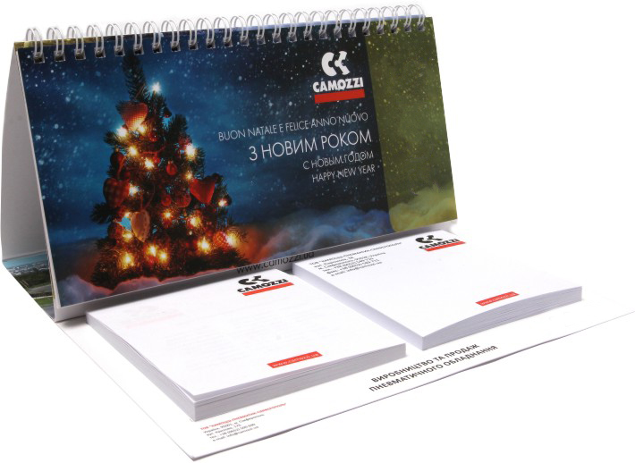Что имеем? Тот же перекидной домик, но с бонусом. 2 блока для записей внизу. А можно сделать 1 блок из стикеров типа post it с печатью лого и второй — отрывной. Или закладки добавить. Или еще что-то по желанию. Но, конечно, все определяет бюджет. Удобно, практично. Блоки закреплены и все на виду. Минимальный тираж календарей-домиков с блоками — 200 штук.